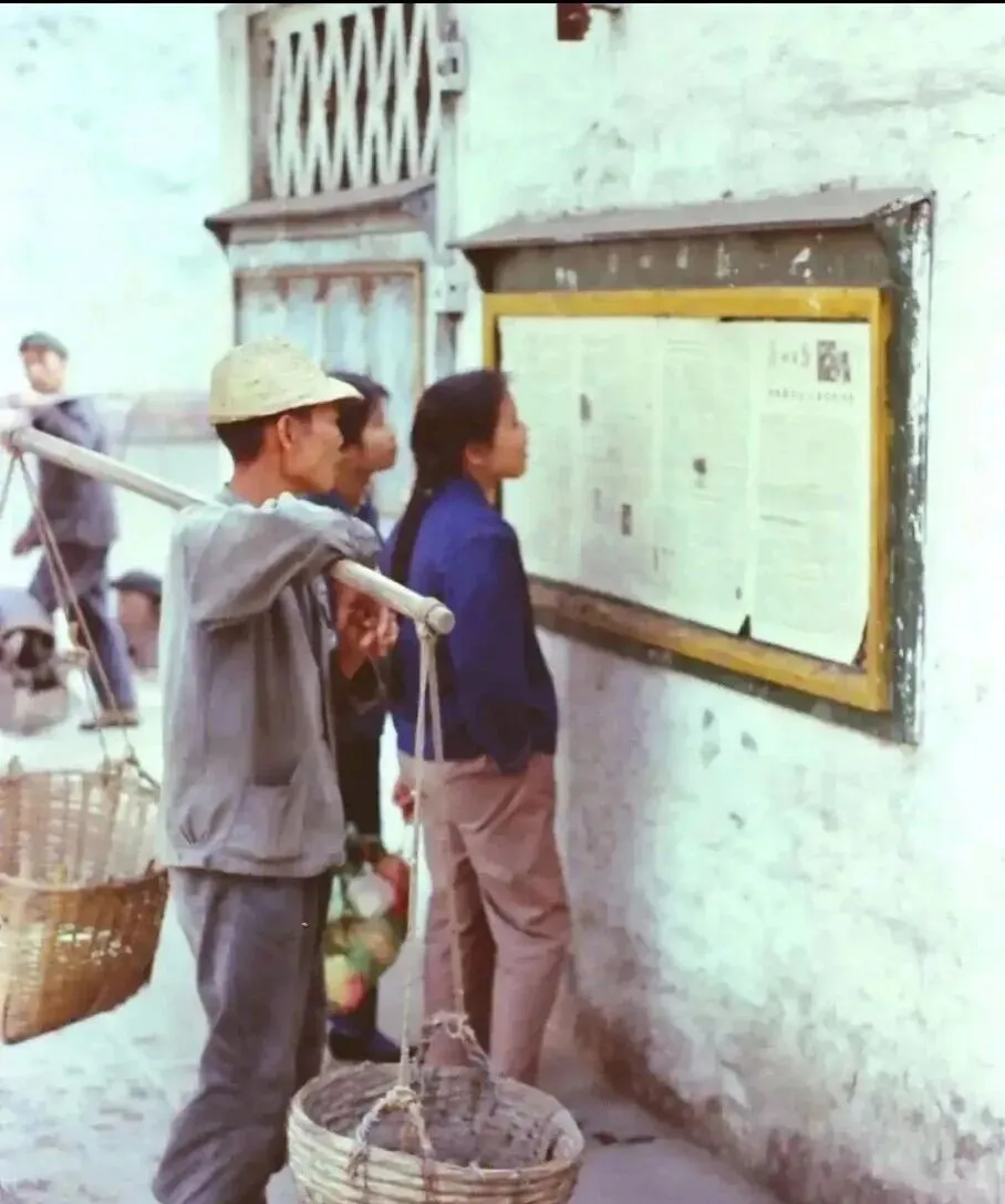 图中几个人围在街头的报栏前,挑着竹筐的劳动者也停下脚步往上瞧,墙上贴的是那时候的报纸,字密密麻麻的,有人戴着帽子仰着头看,有人侧着身子凑近了念,那会儿电视机都是稀罕物,街头的报栏就是获取消息的窗口,每天早上贴新的,傍晚下工路过都要驻足看两眼,哪家有了大事小情,国家又出了什么政策,全在这上头,现在手机一划什么都有,可那时候这一栏报纸就是全部。