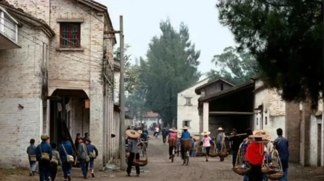 这张是79年佛山石湾镇的街道,泥土路面坑坑洼洼,两边是青砖红砖混搭的老房子,行人穿着灰蓝色的衣裳,有人挑着担子,有人戴着斗笠,还有骑自行车的晃晃悠悠往前蹬,路边的房子墙皮都掉了一块一块的,窗户是木头框的,门口堆着柴火和杂物,那时候石湾镇还没现在这么热闹,街上人不多,节奏也慢,走在路上能听见挑担子的扁担"吱扭吱扭"响。