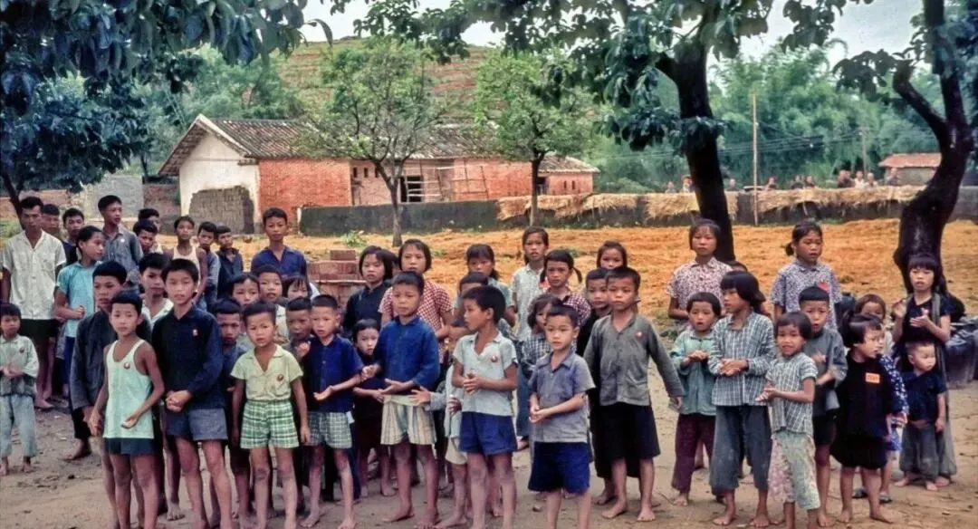 一群孩子站在空地上,好多人光着脚丫子,穿着打补丁的衣裳,胸口别着像章,排成几排站得笔直,这是71年外国摄影师拍的,地点在南方某个人民公社,孩子们眼睛盯着镜头,表情认真又有点拘谨,那个年代的标准姿势,背后是土房子和田地,脚下是黄土地,现在的小孩哪还有这么站过,当时能被拍进照片是件大事。
