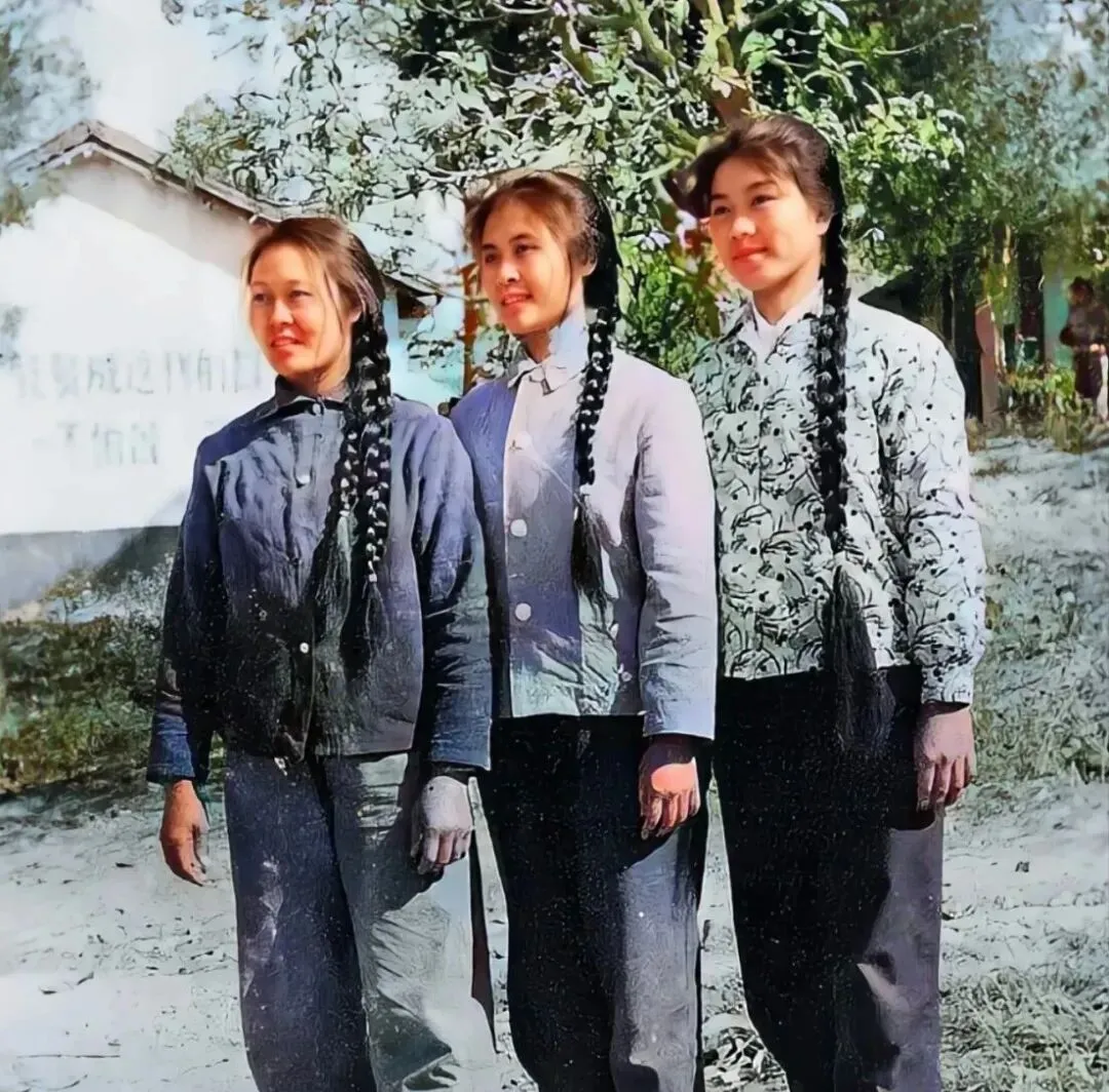 三个姑娘并排站着,麻花辫又粗又长一直垂到腰,穿的是蓝色和灰色的工装,布鞋磨得发白,背后墙上刷着那个年代的标语,"一不怕苦,二不怕死"几个大字还看得清,她们是公社的女社员,白天下地干活,晚上开会学习,辫子是那时候姑娘的标配,梳得整整齐齐,脸上晒得黑红,手上全是老茧,现在谁还留这么长的辫子,谁还穿这身衣裳。