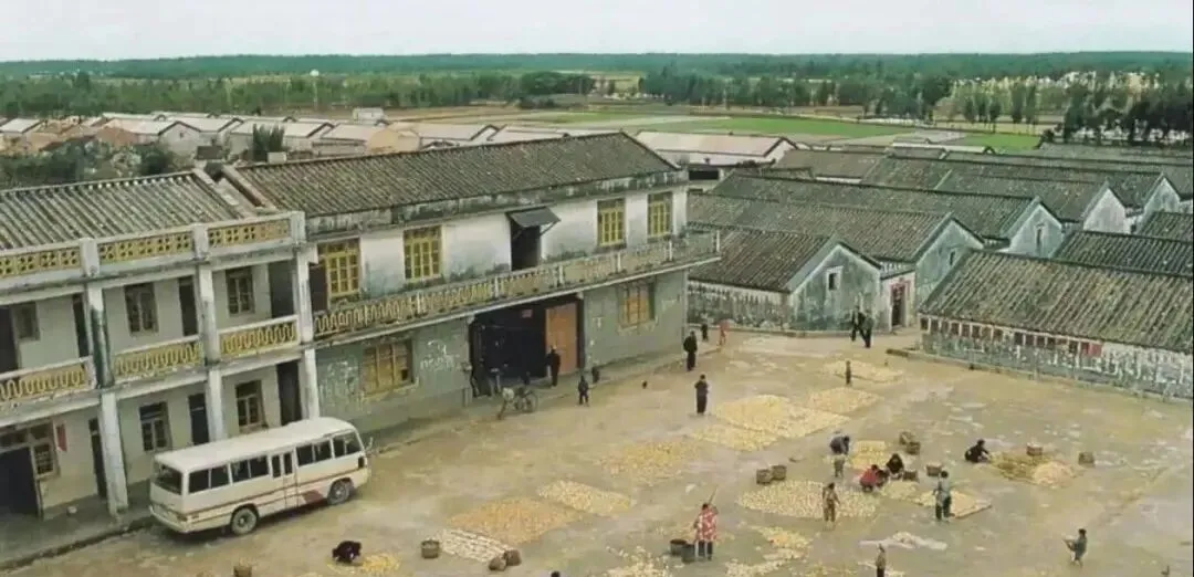 80年汕头潮阳的晒场,一大片空地上铺满了粮食,有人弯腰在翻晒,远处是瓦房和田野,天空灰蒙蒙的,收完粮食就得赶紧晒干,不然容易发霉,那时候靠天吃饭,晒场上都是人,老老少少一起干,用木耙子把粮食摊开,隔一会儿翻一次,晒到太阳落山才收工,现在机器烘干,这种场面看不到了。