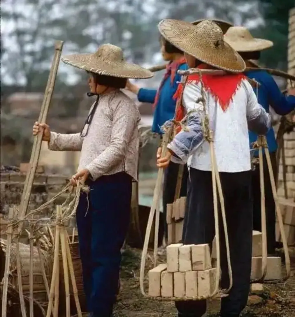 戴斗笠的女工们用竹筐挑着土坯砖,肩膀压得低低的,一步一步往前走,石湾镇做陶瓷出名,砖瓦也是一绝,女人们干起重活来不比男人差,一筐砖得有几十斤,挑一天下来肩膀磨得生疼,可那时候谁家不缺钱,能有份工作就不错了,我妈说她年轻时也在砖厂干过,手上的茧子几年才褪掉。