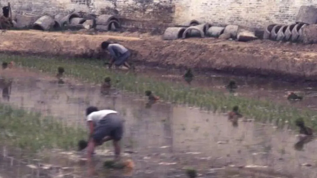 水田里几个人弯着腰插秧,田埂边堆着一排水泥管,那是修水利用的材料,插秧是个技术活,得把秧苗一棵棵按进泥里,行距株距都有讲究,腰一弯就是一整天,直不起来,我爷爷说他年轻时插秧最怕,腿泡在水里又凉又麻,可不插不行,一家人的口粮全指着这些田。