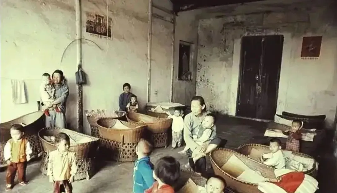屋里摆着好几个竹编的摇篮,小孩子躺在里面,保育员在旁边照看,墙上贴着宣传画,那时候大人都要出工,小孩没人管就送到托儿所,几十个孩子挤在一间屋里,哭声此起彼伏,保育员忙得脚不沾地,摇篮是竹条编的,铺着旧布,现在的托儿所条件好太多了,可那时候能有地方放孩子就不错。