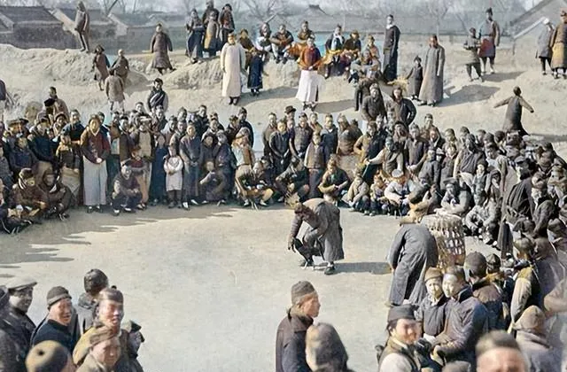 一大群人围成圈子看斗鸡,斗鸡在民国时期是很流行的民俗娱乐,有超过两千多年的历史,两只公鸡打得正酣,围观的人有的蹲着有的站着,眼睛盯着场子里一眨不眨,驻马店那会儿也兴这个,逢年过节村里会组织斗鸡比赛,赢了的人家脸上有光,输了的也不气馁,养着养着明年再来,那股子热闹劲儿,现在的年轻人是体会不到了。
