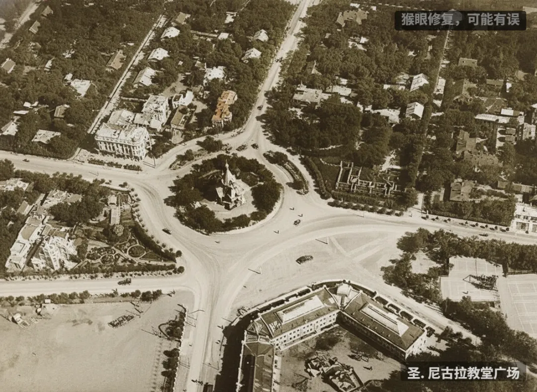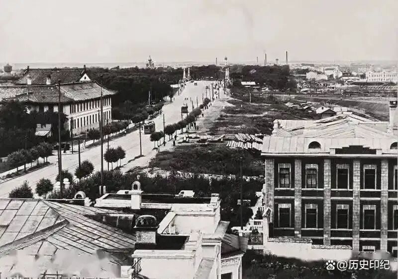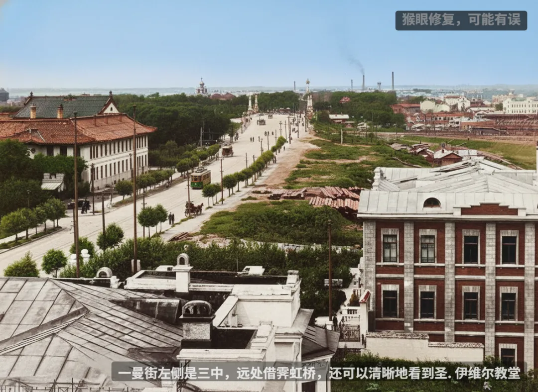 一曼街左侧是三中,远处借霁虹桥,还可以清晰地看到圣. 伊维尔教堂(现哈尔滨站北广场)