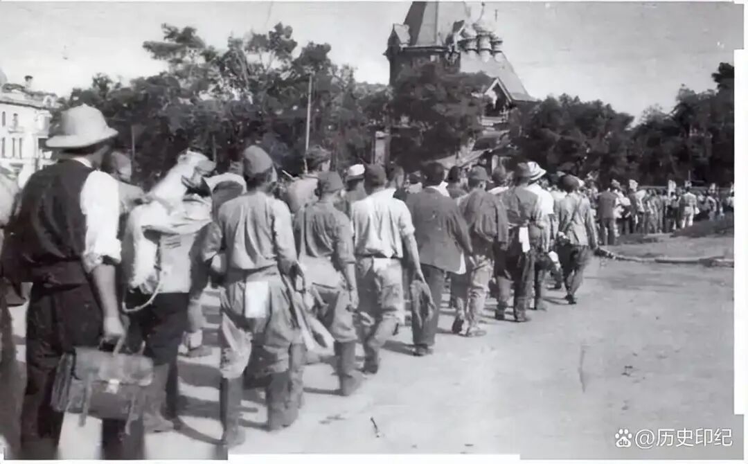 疑似放下武器的日本军人列队走过过圣. 尼古拉教堂