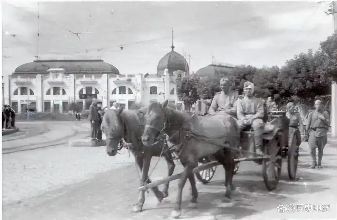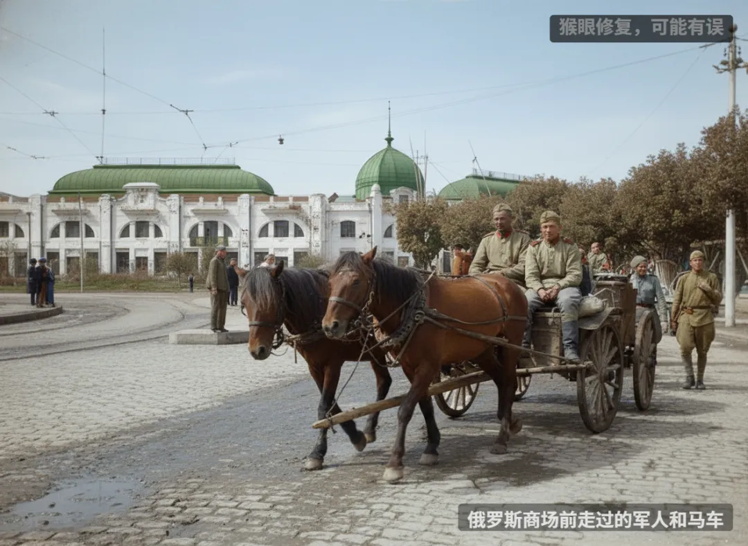 俄罗斯商场前走过的军人和马车。