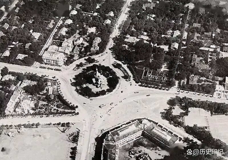 鸟瞰中央大街,左侧马迭尔宾馆(新政协活动筹备旧址)和妇女儿童用品商店至今仍是现今中央大街建筑中的精品