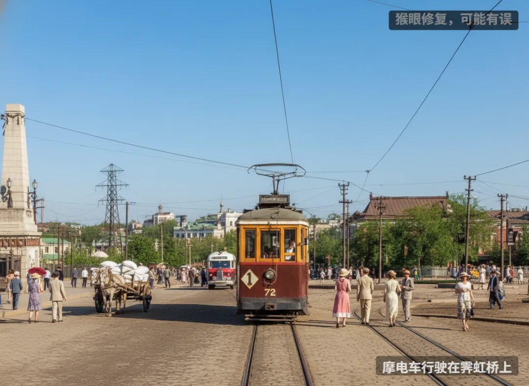 摩电车行驶在霁虹桥上