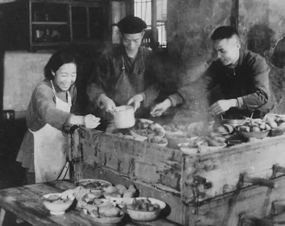 图为上世纪50时代公共性食堂的厨房里工作员做饭的情景。