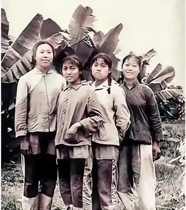 第二张四个姑娘站在热带植物前,裤腿上补丁很扎眼。放到今天,很多人第一眼可能会先看到“苦”,可我反而先注意到她们站姿里那点不服输的劲儿。衣服旧归旧,洗得还算利落,袖口收得紧,裤脚也不拖沓。那个年代的人穿衣,不是为了好看,是为了耐穿、能干活、能顶日子。但正因为这样,照片才更真。