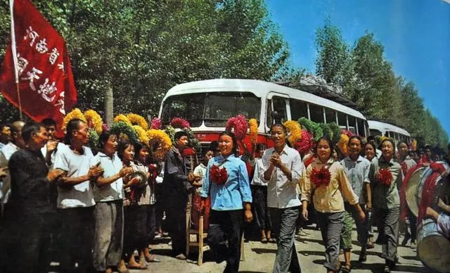 第三张是欢迎场面,车停在路边,红旗、锣鼓、扎花,围观的人挤成一排。中间走过来的年轻姑娘,蓝上衣、浅色裤子,胸前戴着大红花,脸上带一点拘谨,又有点兴奋。要是不说年份,你会猜成什么时候?很多人总以为那个年代只有灰扑扑的一面,可真到这种集体场合,颜色、热闹、仪式感一样都不少。
