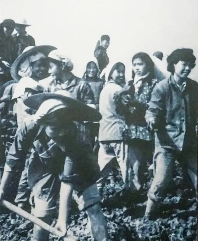 再往后看,味道就变了。第四张是地里劳作,戴草帽的、挽裤腿的、弯腰挥锄头的,鞋上裤脚上全是泥。这里面最有意思的,是几个姑娘一边干活一边还回头看镜头,脸上并不木。累肯定累,可年轻也是真的年轻。那个年纪的人,哪怕是在泥地里,眼睛也是亮的。