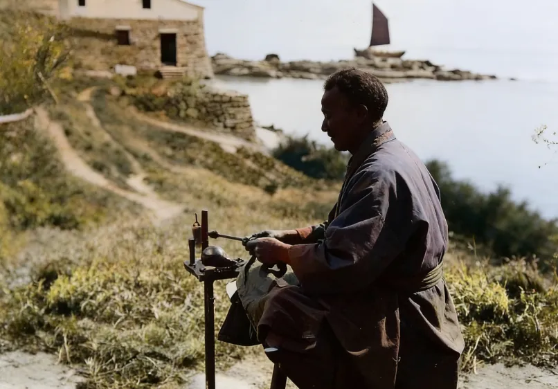 图中打磨的小摊子,老舟山人都知道,一根铁棒撑着,一头磨一头接小水壶,长衫膝头搭布,转着磨盘那几下,咯吱咯吱直转耳朵里去,记得那年陪外婆下船回来,走路总绕过这块草地,就为多看两眼,老匠人的背影只看得见一半,手底下火星子一闪一灭,小刀子收拾完了,刃口净得能照人影,刚磨好的刀腻腻糯糯的,把鱼鳞刮起来声音脆生,后来谁家还会坐港边等刀磨好,都是超市快递刀片直接换,磨刀摊子也只能活在记忆里。