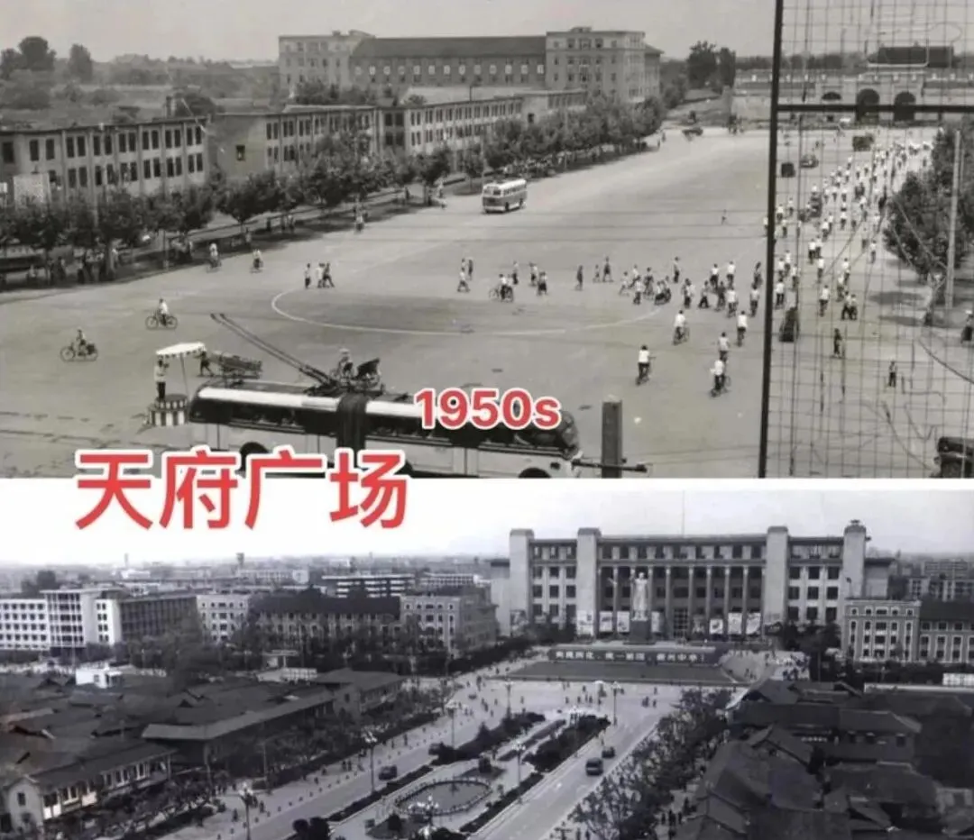 上面这张是六十年代的人民南路,远处能看见百货大楼和新华书店,街面宽敞,无轨电车开过去"嗞嗞"响,那时候天府广场还不叫这名字,下面这张是1983年的样子,毛主席塑像立起来了,人民南路也拓宽了,变成了主干道,两张照片一对比,成都那些年是怎么一步步走过来的,全在眼前铺开了。