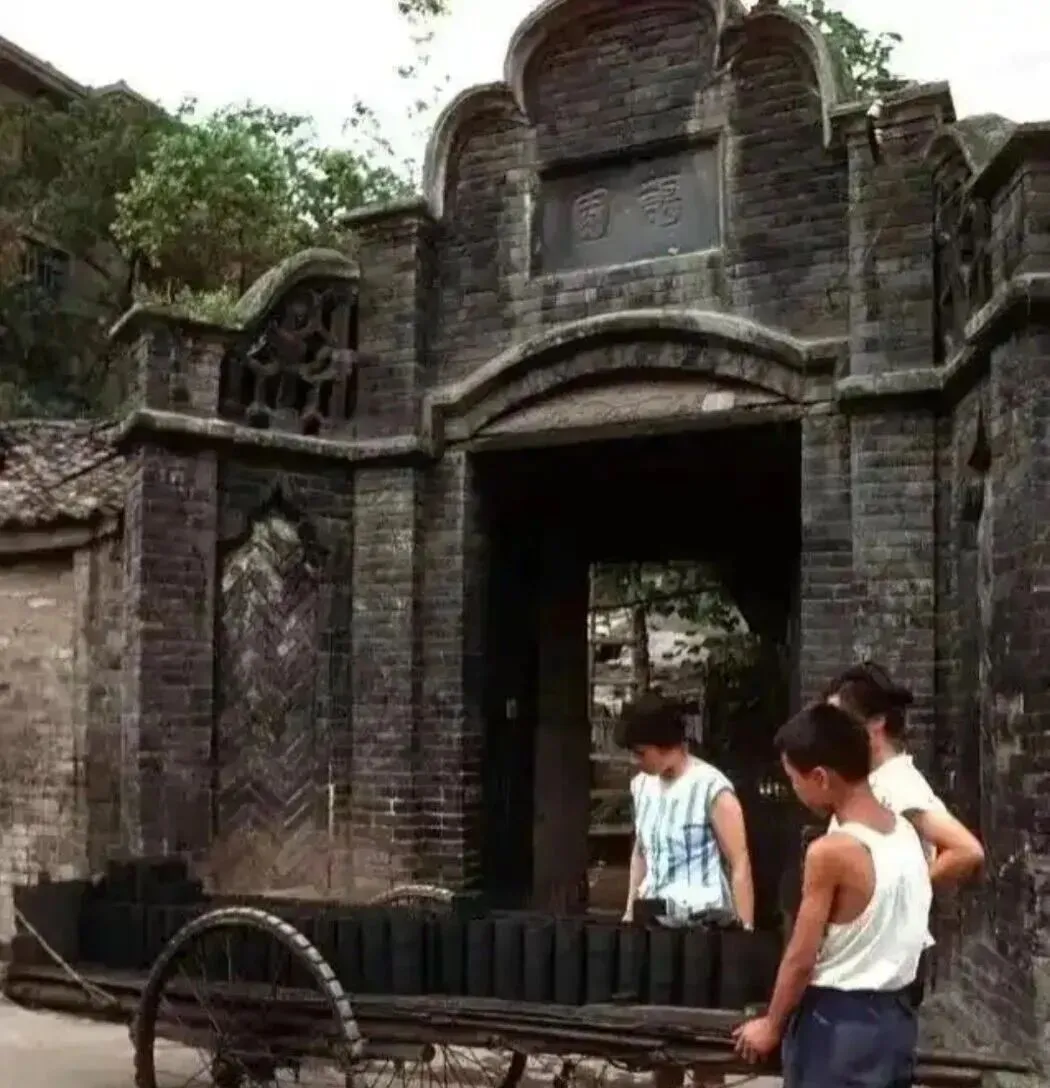这张拍的是成都长顺中街附近,1981年的事儿,一辆装满蜂窝煤的板车停在霜园门口,这是座民国时期的公馆,门头还在,牌匾挂着,那会儿这样的老建筑成都还留着不少,蜂窝煤是家家必备的,拉板车的师傅汗湿了背心,脚下使劲往前蹬,这种场景现在只能在照片里看了。
