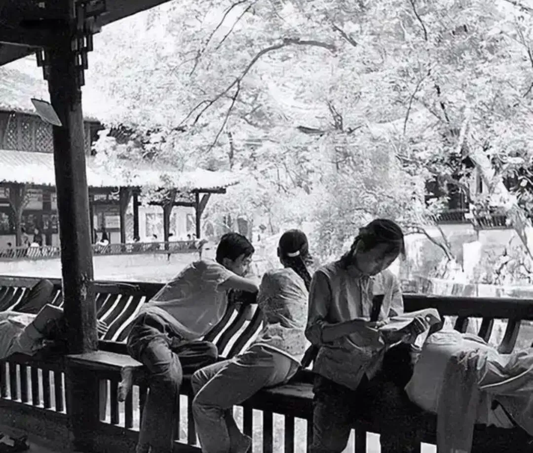 杜甫草堂的长廊,1978年拍的,几个年轻人坐在长椅上看书,阳光从树叶缝里漏下来,那时候草堂还不收门票,周末约着朋友来这儿坐坐,拿本书翻翻,累了抬头看看树影子,日子过得慢,人也不急,那股子静气和现在游客扎堆的样子完全不一样。