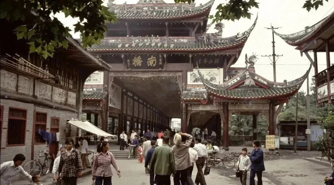 都江堰的南桥,1985年的模样,这座廊桥重建没几年,红柱子绿瓦,桥头人来人往,那会儿都江堰还叫灌县,街面上都是本地人,挑担子的推车的骑自行车的,桥下水流哗哗的,站在桥上能听见,这种古朴的味道现在虽然还在,可那份生活气少了些。
