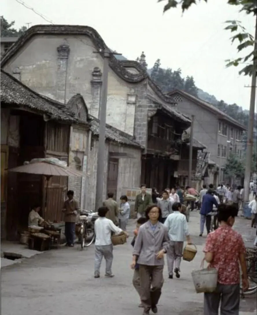 这是灌县的老街,八十年代的样子,街两边全是川西风格的房子,木格子窗户,青瓦屋顶,路上行人提着竹篮水桶,穿着朴素,脚步不慌不忙,那时候街不长可样样齐全,油盐酱醋布匹杂货,转一圈就能买全,这种老街的格局现在难得见了。