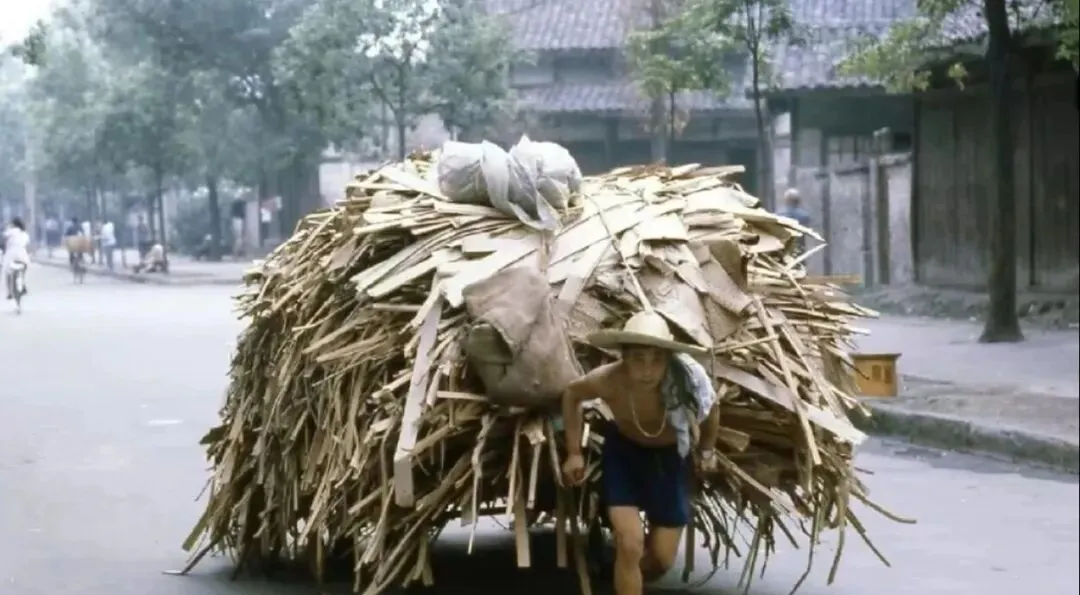 成都街头的架架车,七十年代末的事儿,一个汉子拉着满满一车竹片,架架车是那时候最常见的运货工具,两个轮子一个车厢,全靠人力往前拽,竹片是手工业和建筑用的材料,一车能装不少,拉车的师傅肩膀上搭着毛巾,汗水顺着脸往下淌,这种力气活现在早就被车替代了。