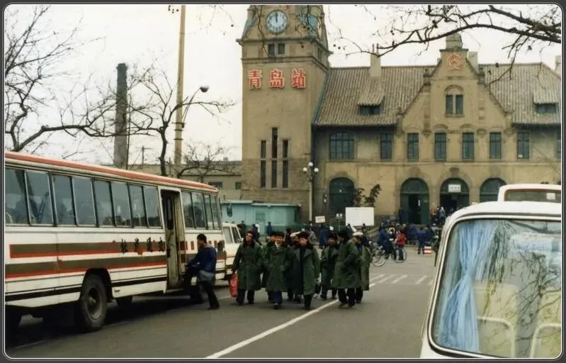 还记得去公用电话亭打电话的日子吗?那时候,并不知道几十年后的现在,手机竟然人手一个!青岛火车站,德国文艺复兴风格德式建筑,由德国人设计,1901年建成,钟楼与坡屋顶曾出现在许许多多的照片里。照片侧面的条纹公交车,也许是长途客车。军大衣也是那个年代最有标志性的过冬衣物。