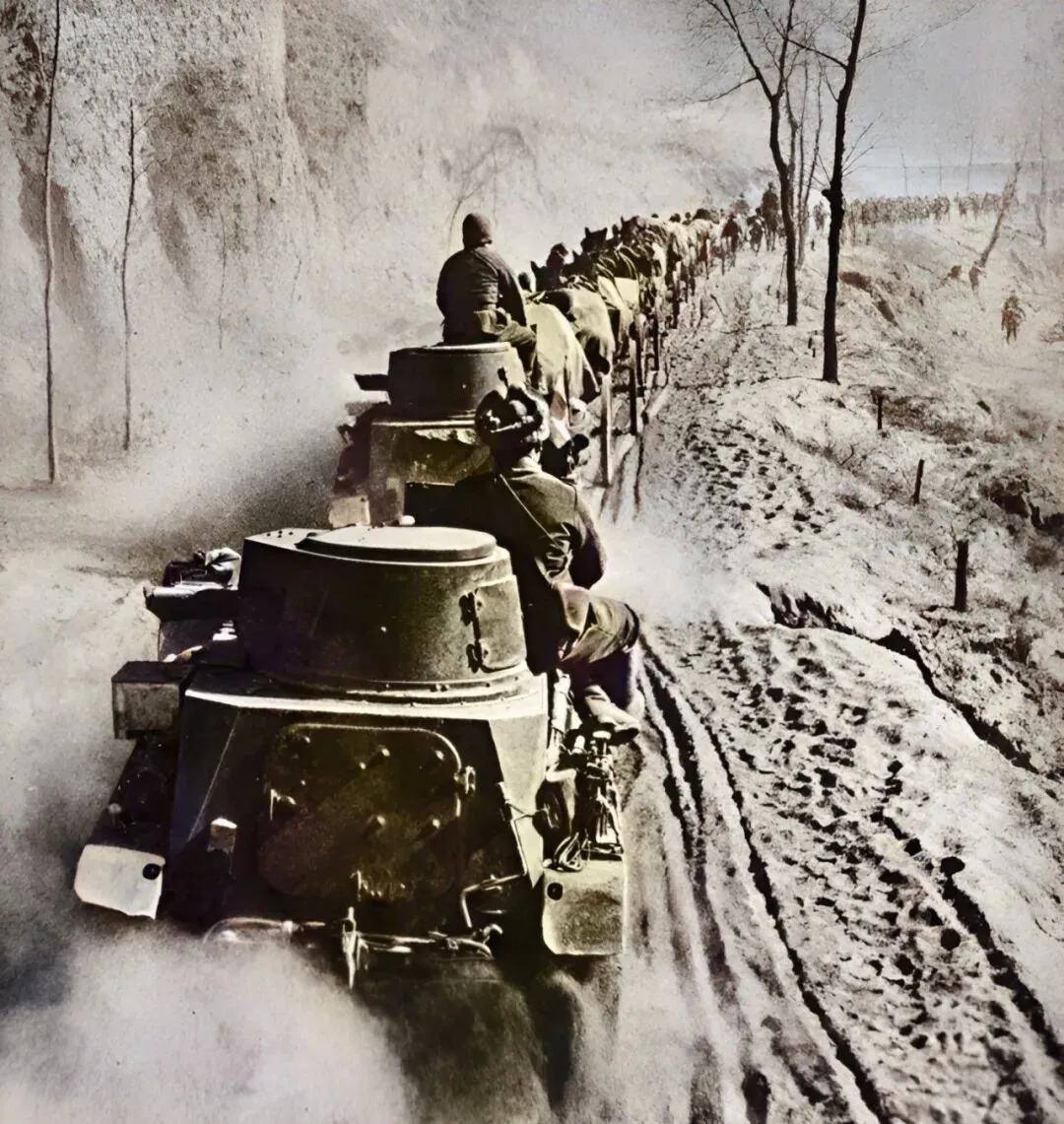 图中这一排铁壳子,是日本装甲车顺着晋南土路往前扎,车尾后头泥巴全都是糊的,原本能走马车的路,被辗出一道道深坑,推车的、赶马的、抬枪的全都排在一溜,老照片避不开那种压人的气息,后排士兵人影点了一排,一个挨一个,拐过弯儿后鸡皮疙瘩一溜下来,爷爷说那会儿,一听到隆隆声,顾不上家里热炕,全家人都往窑洞后头藏。