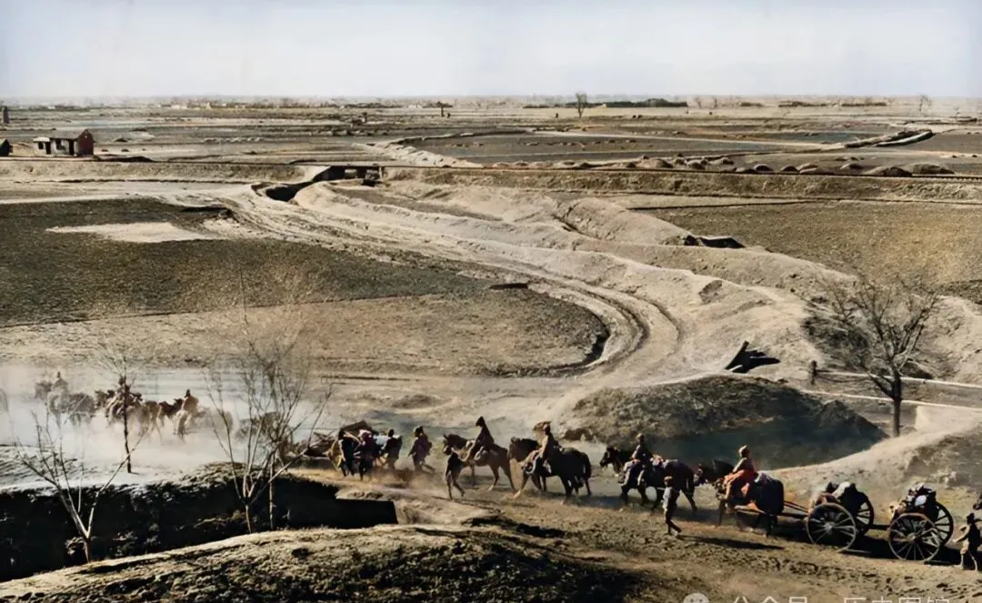 这个场景够开阔,辽阔的田野里,过了一队队骑兵和马车,黄沙带着马蹄声一直卷到天边,队伍里有穿军装的,有赶牛的,拉着炮的,马上的士兵将帽檐压得低低的,就是这段路,天灰蒙蒙的,地上曲曲折折压出一道道辙,小时候姥爷说,家门口土路还没修硬化呢,远远看见烟尘起来,就是有兵过村,大人往家里喊孩子快收拾,谁也不敢多看。