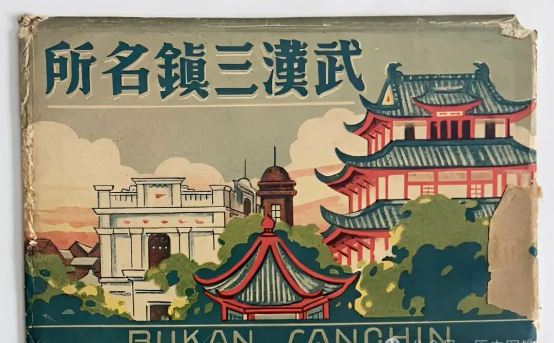 这个颜色明快的封面就是那套有名的《武汉三镇名所》明信片本尊,左边的白色楼是外侨领事馆,右边这三层檐的楼就是老奥略楼,装饰画做得特别精神,那时候寄一张过去,亲戚在外地看到封面就能认出是武汉。