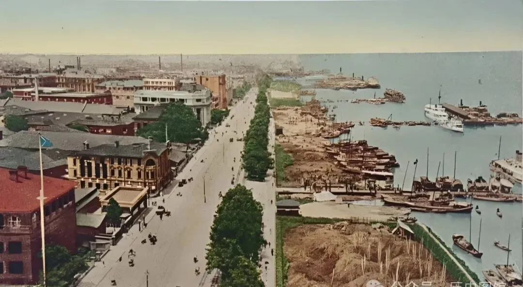 走到这段宽阔的大路,汉口人都叫她沿江大道,原本是“河街”,图里能看出来两边全是欧式大楼和商铺铺张开来的气场,有些楼上还写着招牌,电线竿、旗杆和街边树影交错,妈妈说那会这里是汉口最时髦的逛街地,西装旗袍、洋车叮当,没几年变成全武汉人都认得的地标。