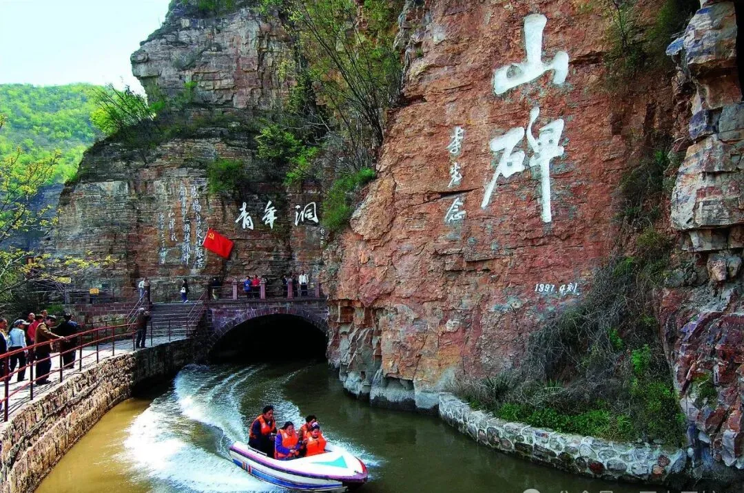 图上的地方叫青年洞,大石头上几个白色大字横在眼前,身边插着红旗,崖下水面平静,船划过去带起长水痕,这隧洞可是红旗渠里头最让人咬牙的工程之一,崖壁全是硬石,哪有啥先进家伙,就靠手锤钢钎一点点钻。