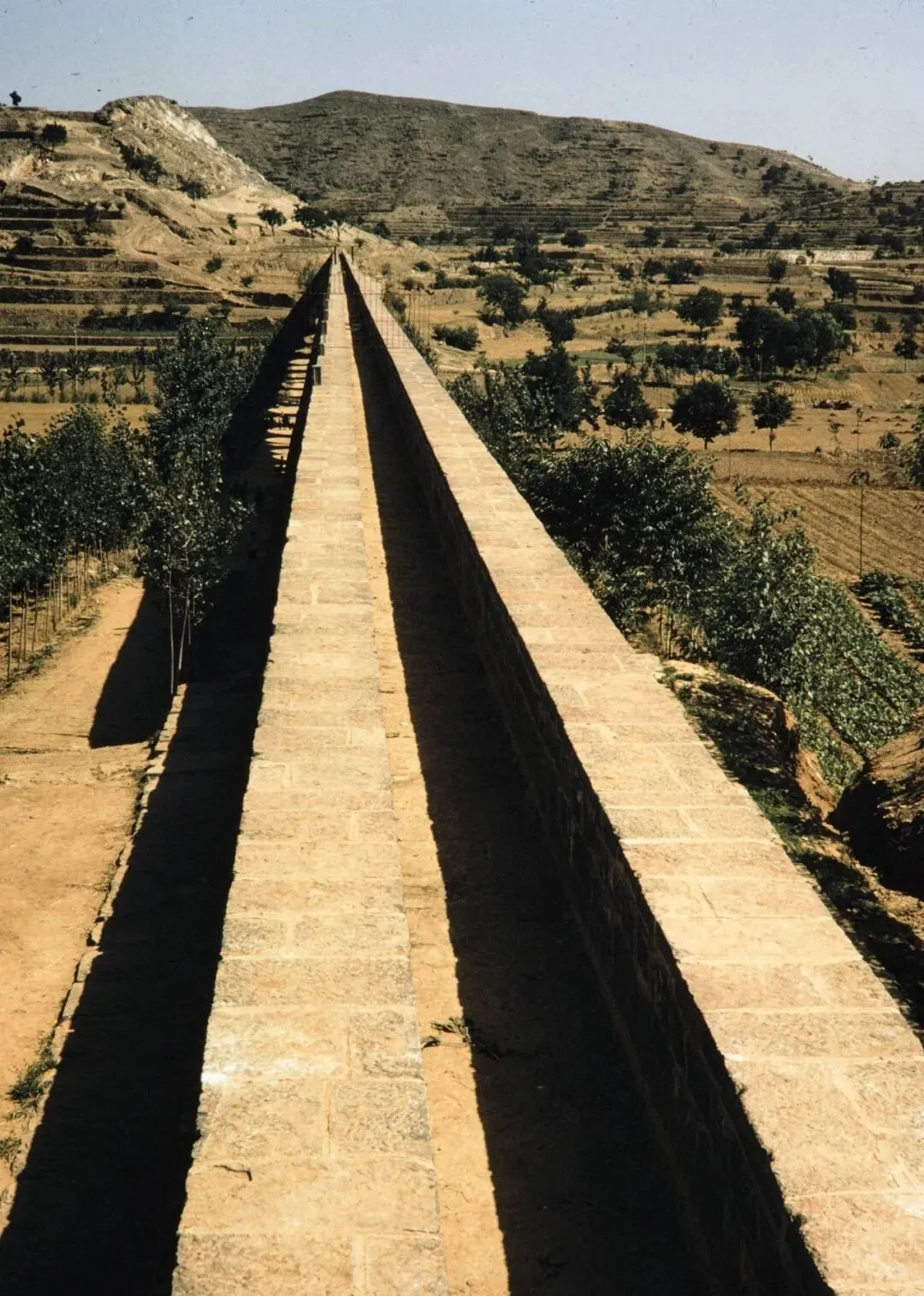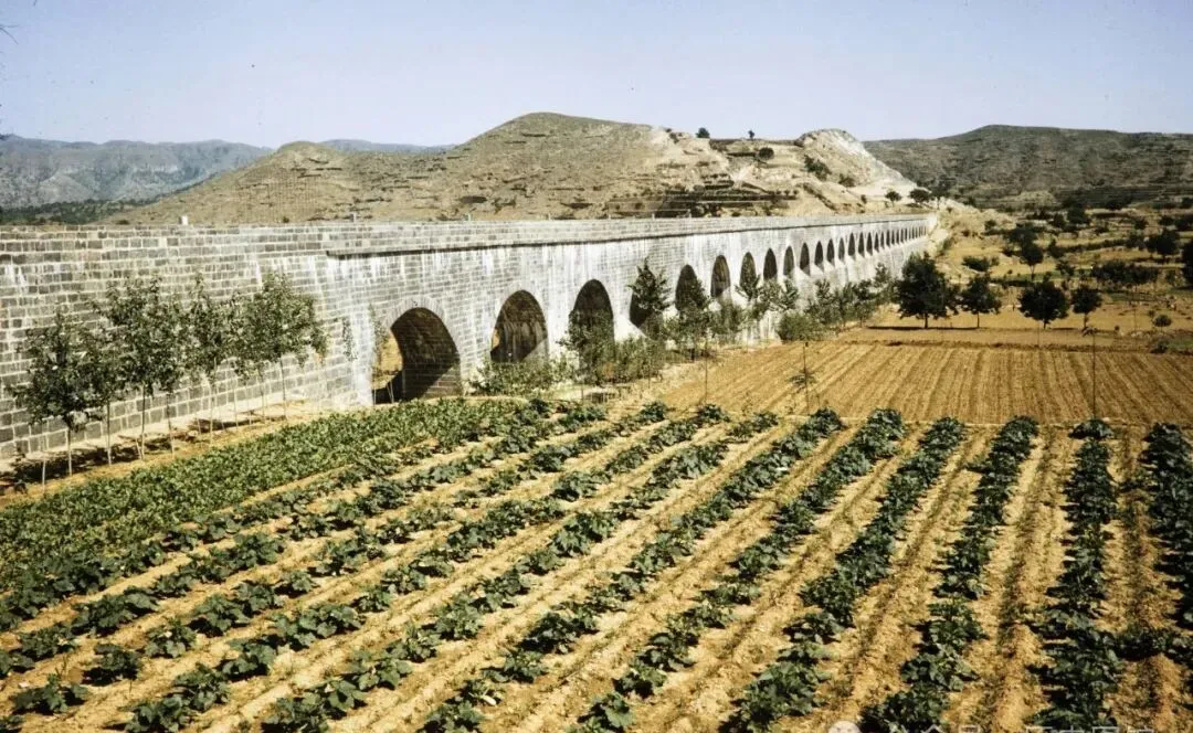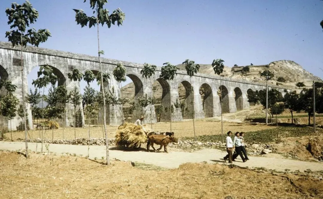照片里竖着一排拱桥似的东西,学名叫红旗渠渡槽,用石头一层层垒起来,跨过一大片庄稼地,远处还跟着几头牲口,拉着干草走,小时候家里也种地,老爸每次天旱就指着渡槽那边说,这水要是顺顺当当进地里,秋后收成就踏实,这东西要是塌一块,都成了大事。