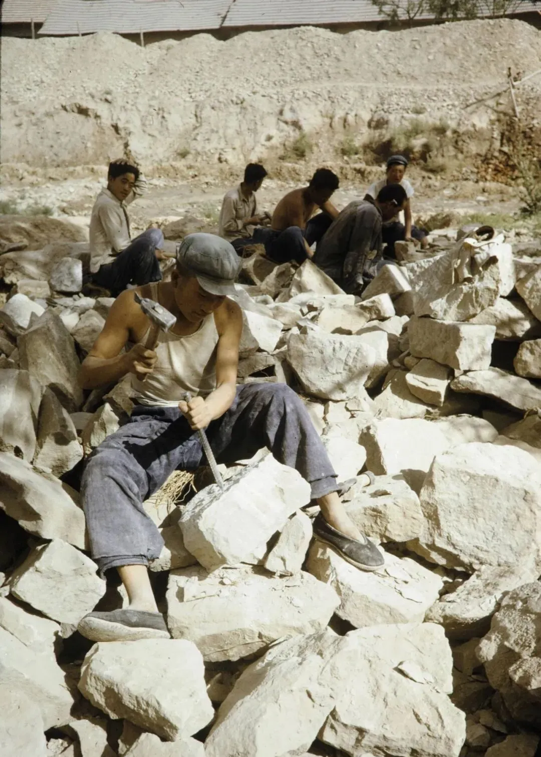 有一年盛夏,天一热,汗珠子滴石头上啪啪直响,也没人喊苦,大家后背全是白色粉尘,远远看成了一群“白石头人”。