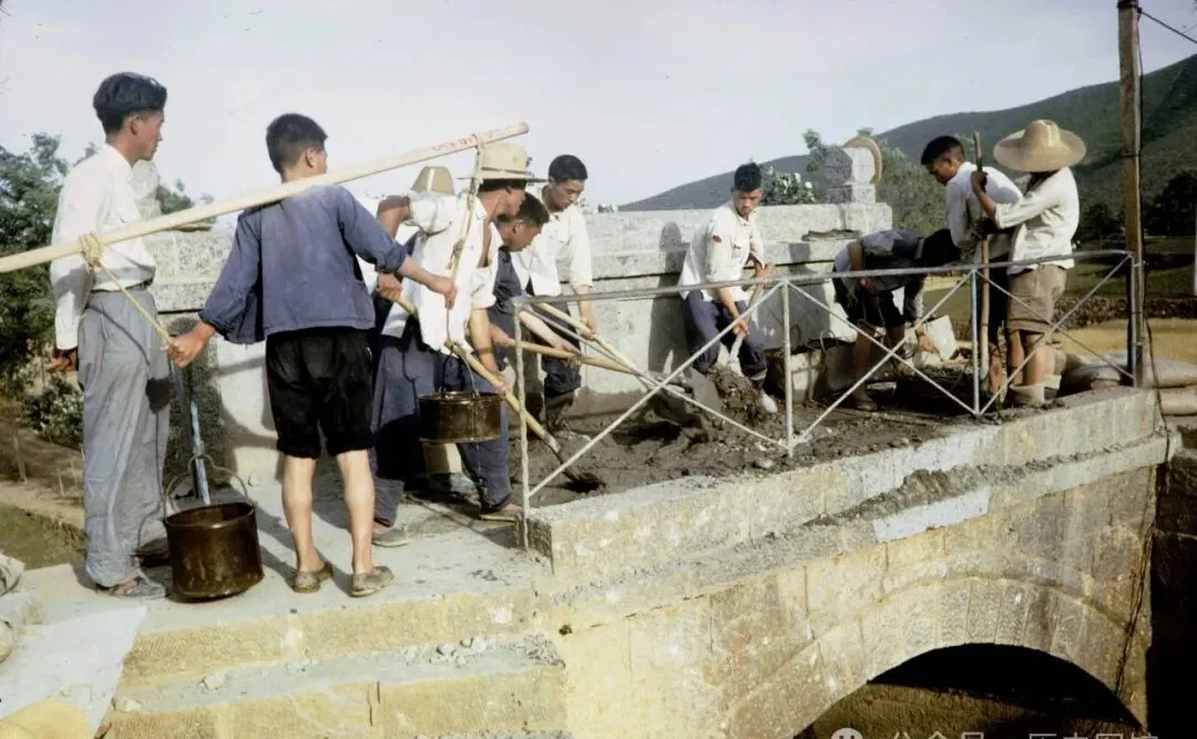 这张拍的是几个小伙子抓着铁锹抹灰浆,水桶全是扁担挑来的,工具单调,脚底下踩得是新砌的石坎,谁要手没把稳撒下一抹灰,就得被老队长喊:“小心点,掉地上石缝进泥,得都扒拉出来再砌。”