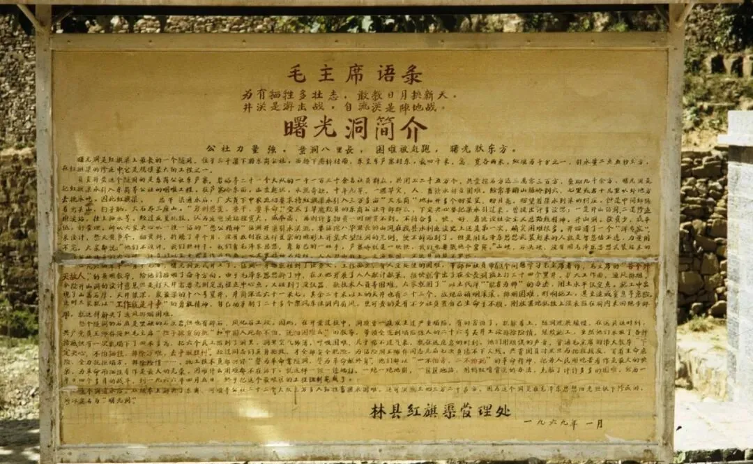 老旧的牌子写着曙光洞的事迹,一条路怎么修、多少人参加、当年遇了多少难,把该记的全写出来,大家围上去看,有不识字的就叫身边娃娃:“给我念念,上头说的啥。”