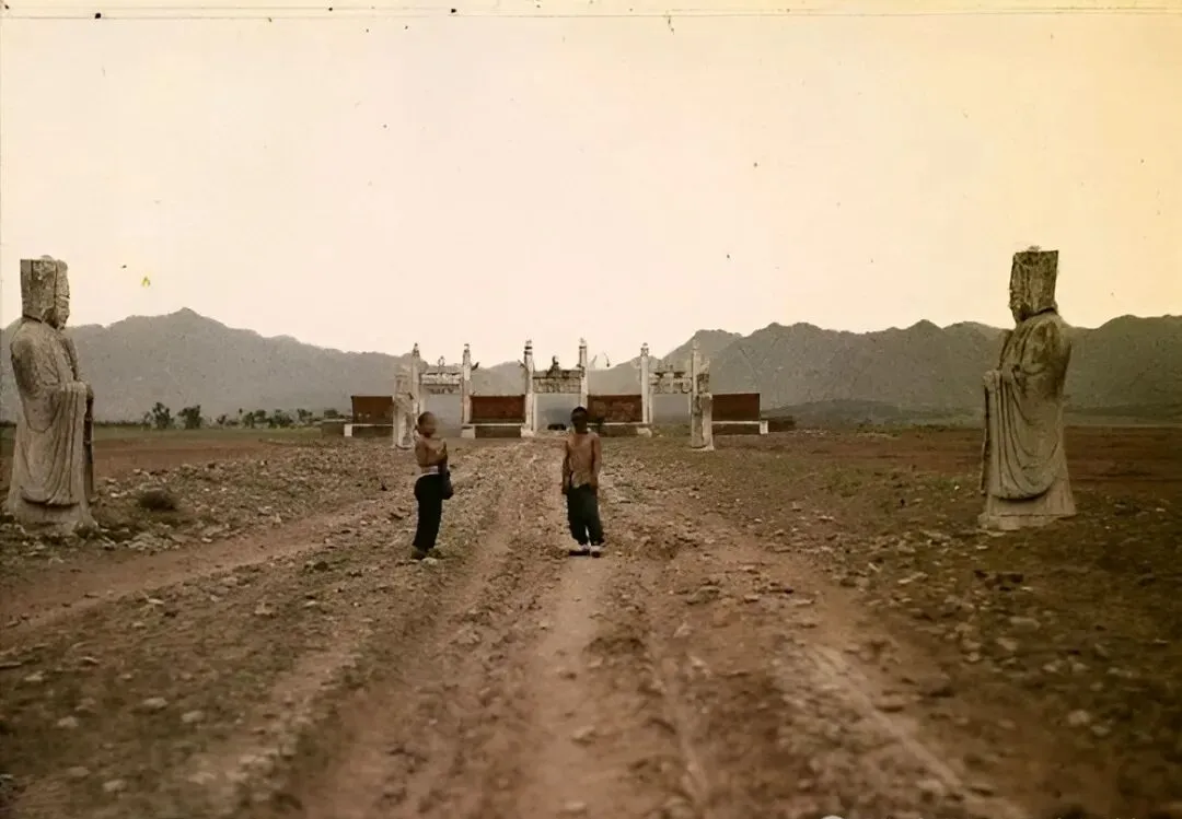 这段路是神道,两边石像扎堆排开,文官武将都盯着,地面是深深的车辙和碎石,土路凹凸不平,走在上头一步一个坑,两个孩子光膀子站路中间,离远了看还真显小,奶奶说她小时候去那里拾柴,还以为这些石人晚上会悄悄换位置,胆小的都不敢靠近。