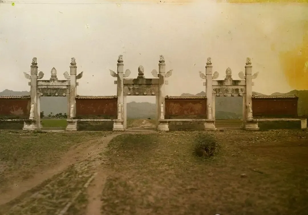 过了神道能看到棂星门,跟现代的宫门比起来,这三扇火焰牌坊造型讲究,白玉柱子,墙体红得沉稳,雕上各种吉祥纹样,本来门上是有红漆大门的,照片里已经不见踪影,只留下几道残影,高低错落,远处望过去像一道屏障,隔着时间看,倒还多了点故事味。
