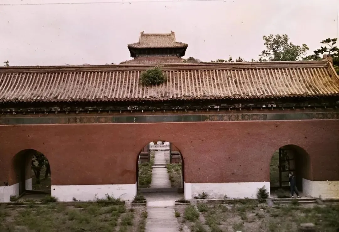 明楼正面两层黄色琉璃瓦顶,墙根处早已经有杂草打窝,墙体泛着旧黄,昔日的气派如今也沾上了野趣,这排场只有老照片里才见得清楚。
