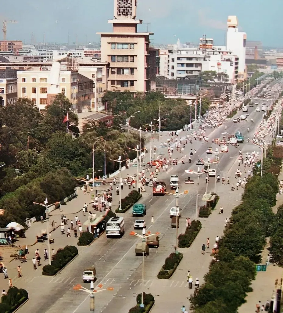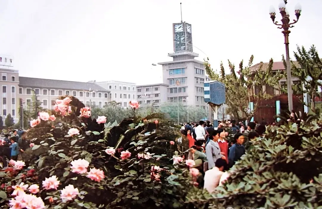 看到这图,就晓得八十年代的成都春天有多热闹,天府广场边上鲜花开得烂漫,一大家子带着孩子出来逛,那时候“花重锦官城”不是叫着玩的,远远看见钟楼,背后楼房低矮,给人一种城市慢慢拉开天幕的感觉。