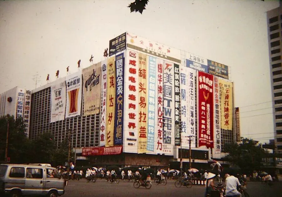 那年头,成都百货大楼外头能挂一排横幅,开糖酒会的时候附近全是人,招牌大大的铺满墙,妈妈说以前年货赶在这里囤,和小伙伴挤电梯就是一种体验,不少人买块布都要排队半天,遇到啥新品种电视冰箱啥的,更是“抢破头”,那叫一个红火。