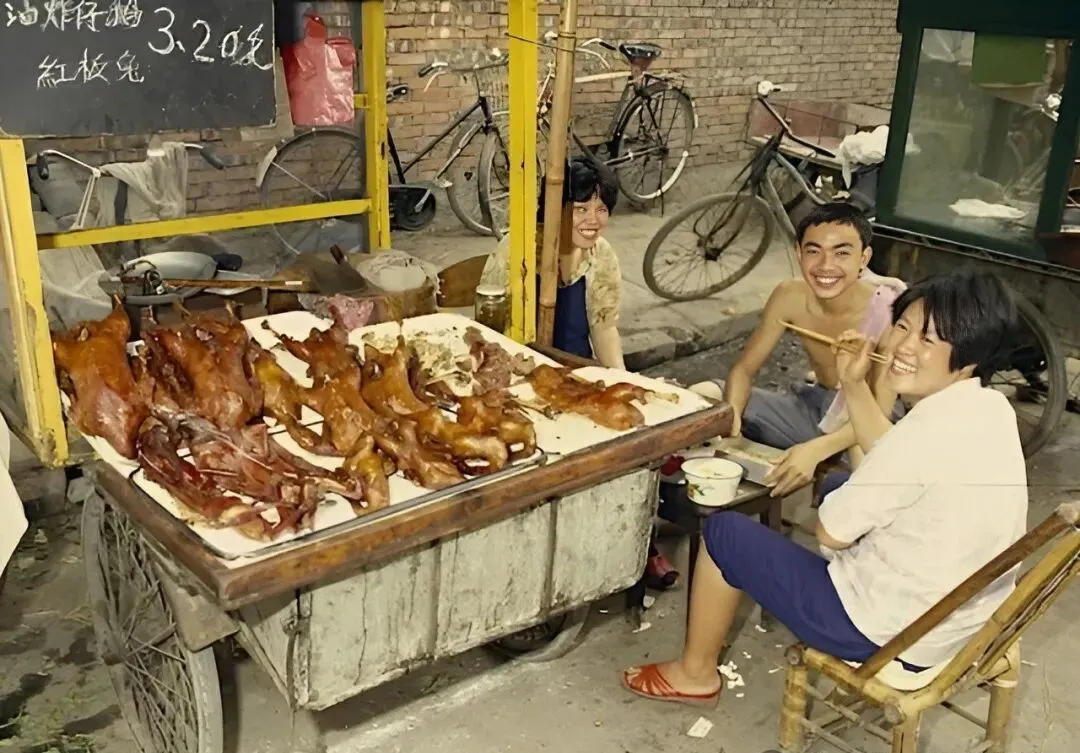 图中的熟食摊摆得满满的,油炸仔鹅、红板兔堆一堆,手写牌子上还标着“三块二一斤”,三两个年轻人围着边吃边笑,小时候这些摊点最香,晚上打着饭盒直接来一大碗,老板爱和人开玩笑,边卖边唠嗑,味道和现在大饭店里头的不一样,那股烟火气,散不开。