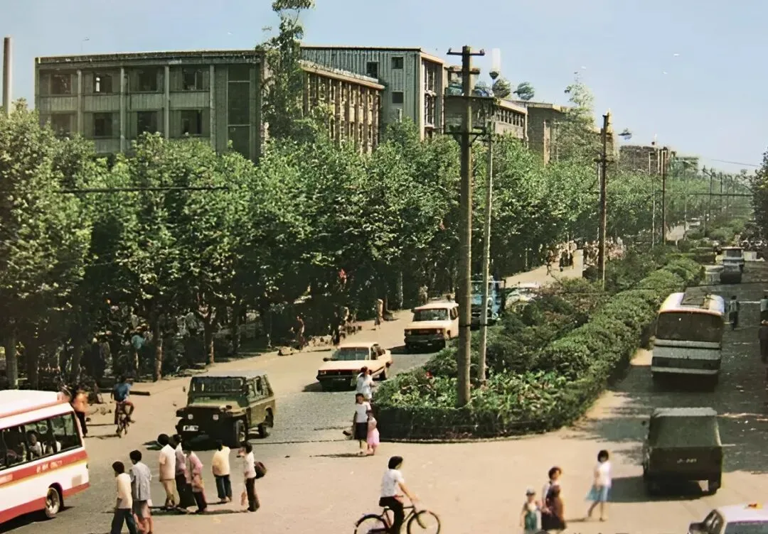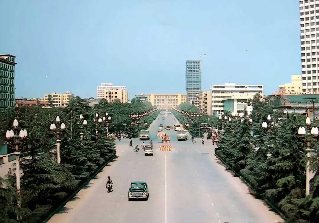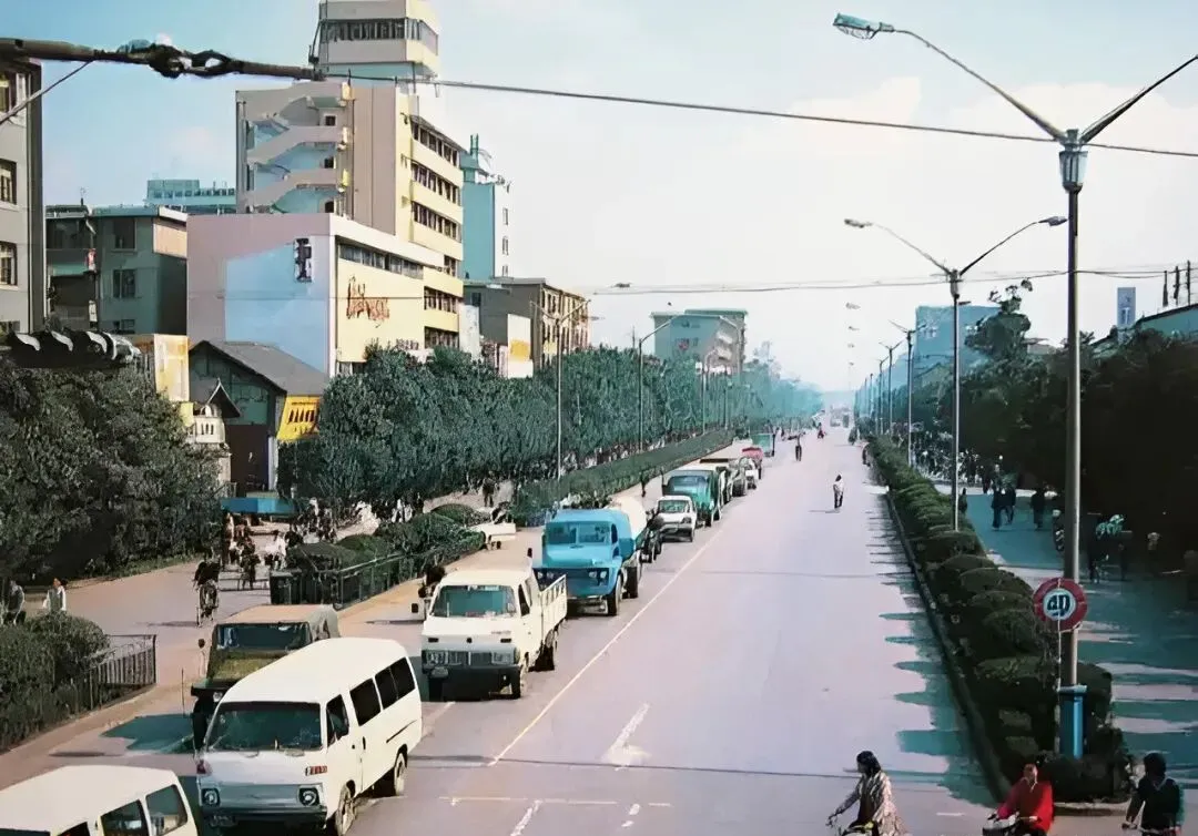 照片上这条大路,当年是蜀都大道,八十年代的成都汽车不算多,骑车的徒步的反而占了大多数,马路上阳光刺眼,路灯排列得整齐,家里的老人回忆说那时候堵车是个稀罕词儿,偶尔听见喇叭响小孩都新鲜得很,想着将来能坐辆小轿车就算本事。