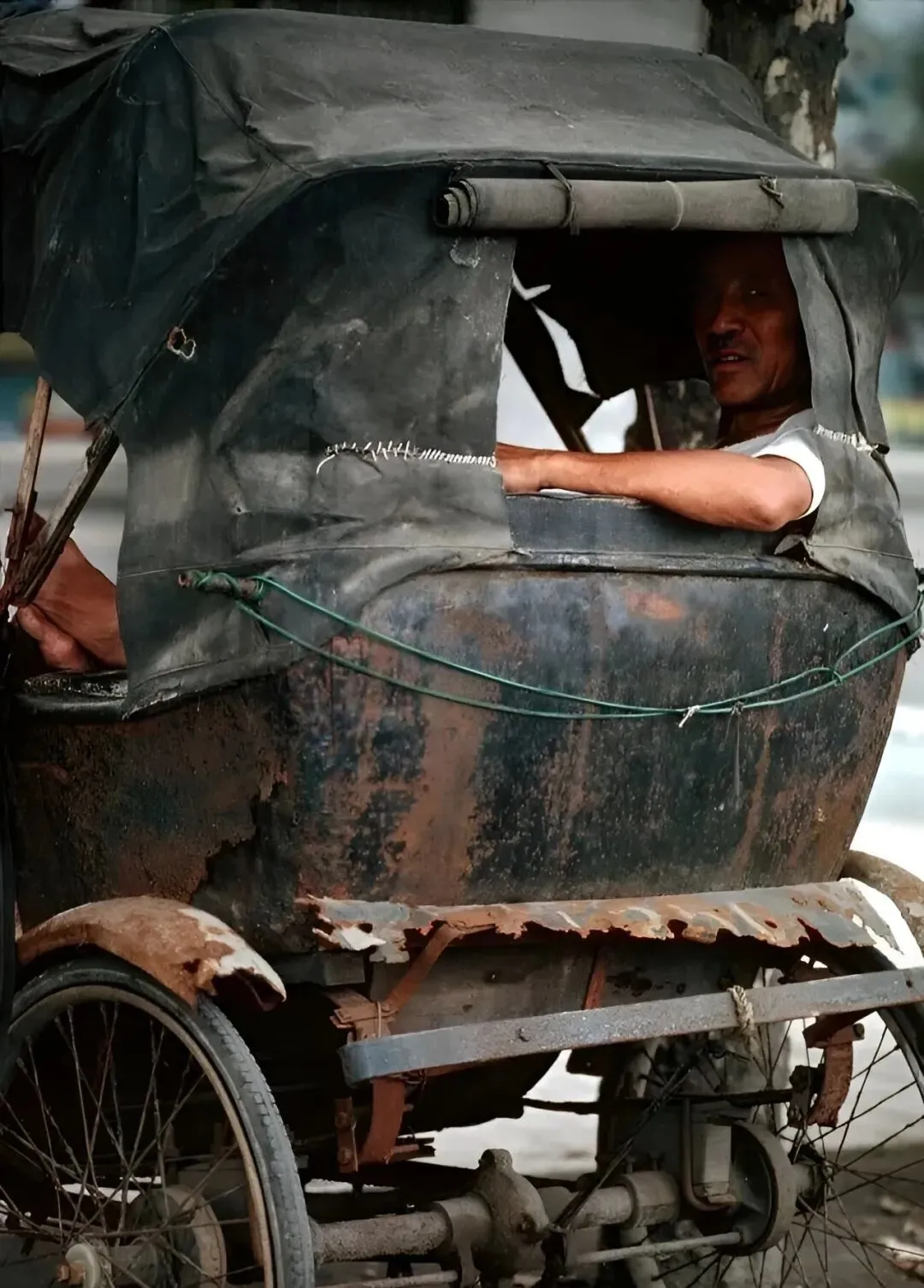 图中锈迹斑斑的三轮黄包车,篷子边还手缝着补丁,车夫坐里面歇气,八十年代街头巷尾到处跑这种车,夏天骑上一趟背都能汗湿,车夫常年晒得黑里透红,见人拍照还要憨憨地望一眼,成都的脚步那时多慢,一转个弯就进小巷。