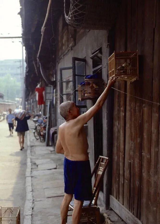 前卫街老屋前,一位穿短裤的老人正在给鸟笼添食,这边院子里一到早晨就有鸟叫,老成都人养鸟是讲究的,一根竿子挑着几笼,边洗衣边遛弯,全是生活琐细,午后坐着摇蒲扇,邻居串个门能聊半天。