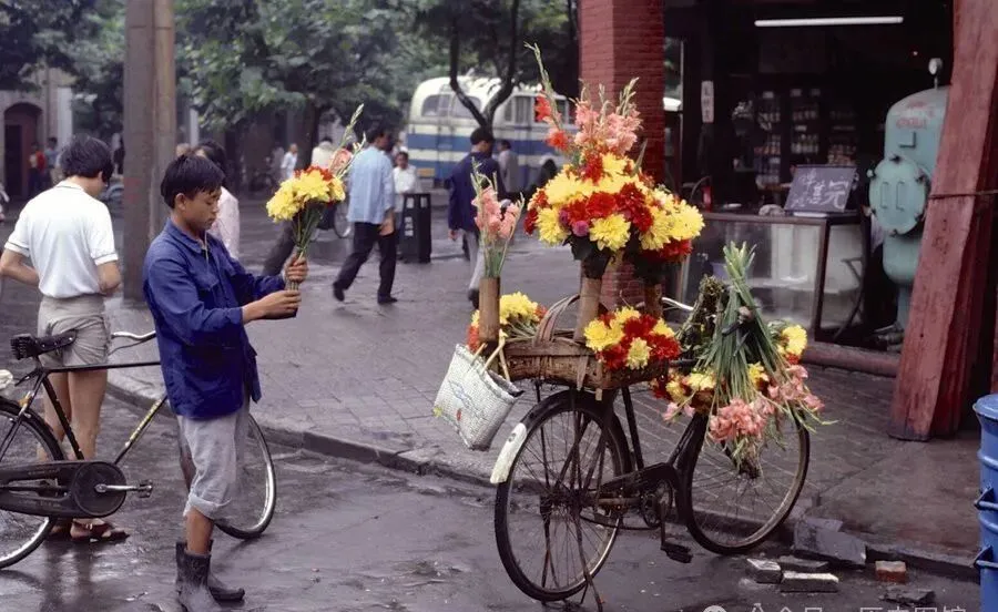 三轮车上扎满了鲜花花束,骑车的师傅穿件蓝工作服,两只手麻利地挑花分枝,那个年代,送花是稀罕事,路边卖给小年轻的,转头拿回去就叫浪漫,现在随便哪个地铁口都有花店,这种野趣味稀罕了。