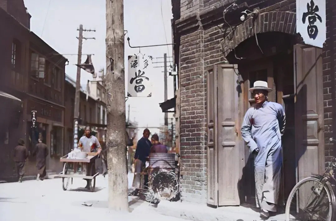 图中这个当铺,黑砖墙、木门檐,招牌上的“当”字写得大,二老板穿长褂斜靠门框,脑袋顶上一顶白帽子,一副见多识广的模样,奶奶说,过去日子紧张,谁家真见不得几块钱,衣服、首饰、锅碗瓢盆都能当,能解一时燃眉之急,出来进门的那一刻,有点体面还能留着。