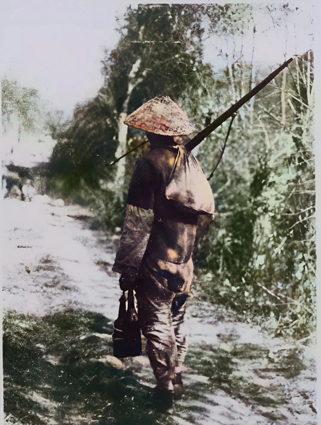 照片里这位戴斗笠背长枪,身后掮着沉甸甸布袋,正走在林子边上,身影有点孤单,靠的就是那股子硬劲儿,那会儿山里猎物真不少,都归自己说了算,打到家能吃能卖,猎人嘴里叼着旱烟,背影像极了东北老故事里的大侠。