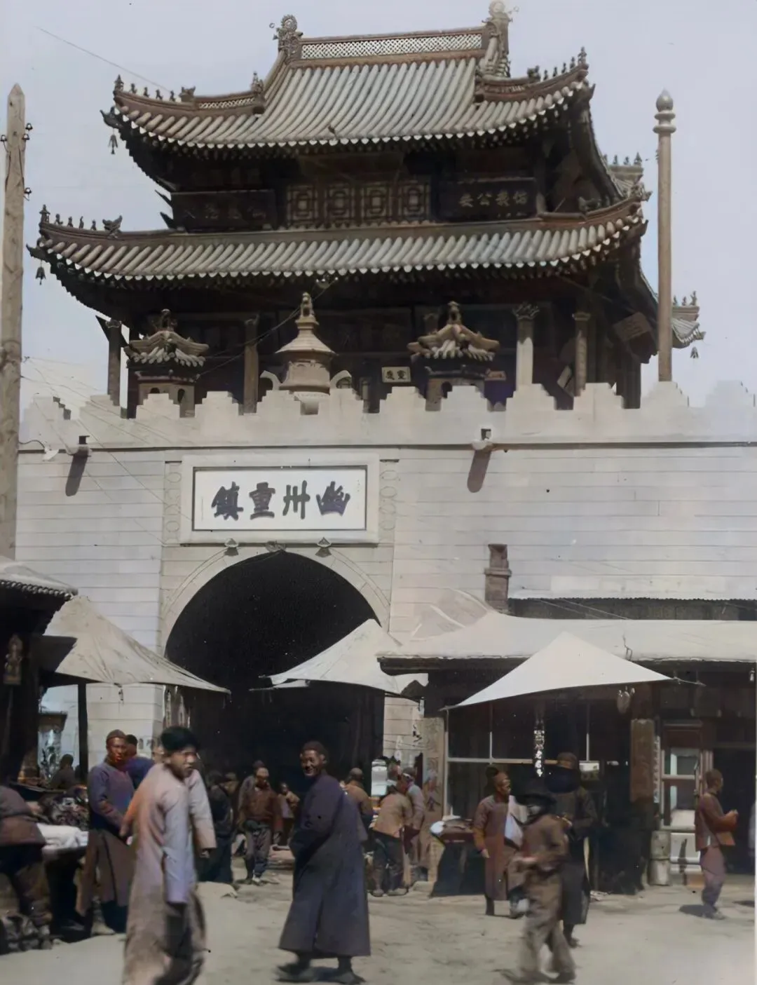 这个鼓楼,屋檐高翘,四个“幽州重镇”写得醒目,城门下的小贩热闹得紧,有的卖点小吃,有的修东西,旧社会留给人的印象不止是苦,更多的是“什么都得靠自己”,手艺和胆量,都挂脸上。