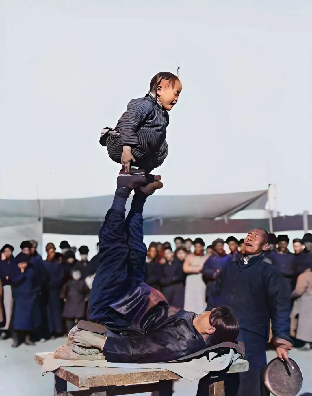 庙会上桌子上顶着个小孩,下面大人腿一撑,玩的是刺激,旁边围着一圈人全盯着瞅,小孩儿敢上去,大人心也大,旧社会的杂耍人没啥花头,手里的饭碗都是自己挣来的。