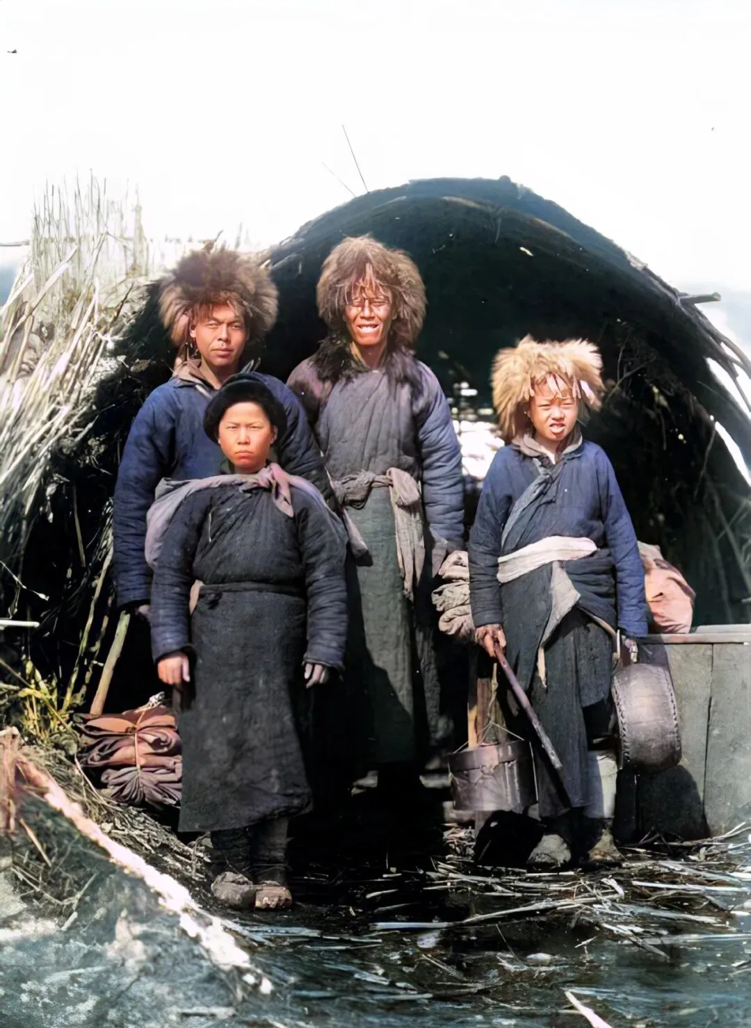 四个人挤在苫顶窝棚下,毛茸茸的帽子套脑袋,脸色冻得发红,不管日子多难,两个孩子还带着一点笑,嘴上没说苦,身上全写着,老东北的硬骨头,小孩子也有。